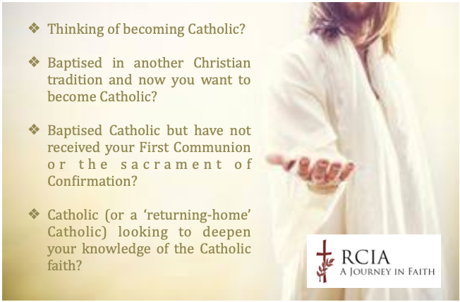 RCIA is a 12-month journey in faith (starting in the month of May of each year, i.e. after Easter – the date is advertised in the Parish Bulletin soon after Easter) for those who are unbaptised, those baptised in another Christian tradition, Catholics who have not received their full sacraments of initiation or Catholics who seek a deeper understanding and experience of their Catholic faith (if you are a ‘returning-home’ Catholic, then welcome back!).